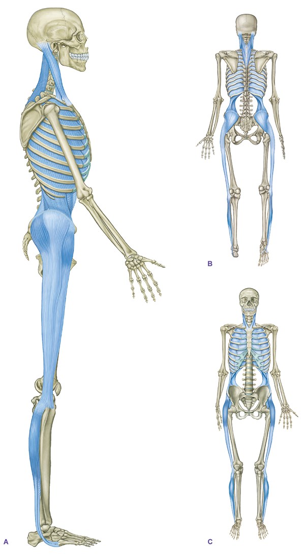 The LL takes root from both the inner and outer mid-foot, but both tendons come around to support the lateral arch and the outside of the ankle. The line continues through the peroneal muscles of the outer calf, which then blend into the iliotibial tract, a very strong sheet of fascial fabric that you can feel just above your knee. This continues up the outside of each thigh and widens out to cup the thigh bone and attach to the iliac crest at the belt line. From the waist up, the LL form a series of Xs similar to shoelaces— in essence, lacing together the front and the back. This pattern continues up the rib cage, hidden under the large shoulder muscles. But the LL re-emerges in the neck with the last X as two broad muscles that work to keep the head balanced and still as the body moves underneath— an active process in riding.