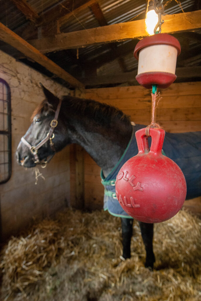 Consider location. A horse who generally shows interest in what’s going on around him might fare better confined to a stall that has a view of the aisle or other area of the barn where there’s a lot of activity—for instance, the wash stall or tack room. A window that looks out onto the pasture and beyond would be another good choice. The abundant natural light it supplies will be a plus. One caveat: A horse who can only watch the action may feel left out and despair at being unable to join, especially if his stall is near a door where others are coming and going. So you’ll want to balance his need for entertainment with his desire to participate when choosing a spot.