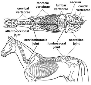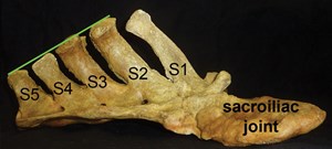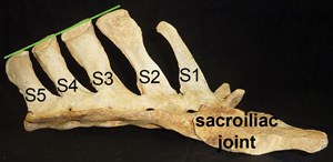Figure 1 shows the anatomy of the sacrum from the side view. The underside is formed by the fused bodies of the five sacral vertebrae with their five spinous processes protruding upward. The spines on the sacrum get shorter from front to back. The tips of these spines form the topline in the middle of the horse’s croup.