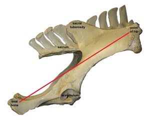 The horse’s head would be to the right and the tail to the left. The three bony prominences have been labeled: point of croup, point of hip and point of buttock (see Figure 3). The acetabulum is also labeled; it forms the articulation of the hip joint. A lower position of the acetabulum favors the ability to perform highly collected movements.