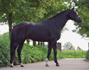 The warmblood is often considered the standard for ideal dressage conformation. The photo below illustrates how the hindquarters of successful dressage horses often have pelvises that tend toward the longer end of the spectrum and have a moderate slope.