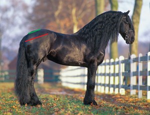 The Friesian sport-horse bloodlines, as illustrated by the horse in the bottom photo, are becoming increasingly popular for dressage. This Friesian sport horse has greater length and less slope in the hindquarters compared with the horse above.