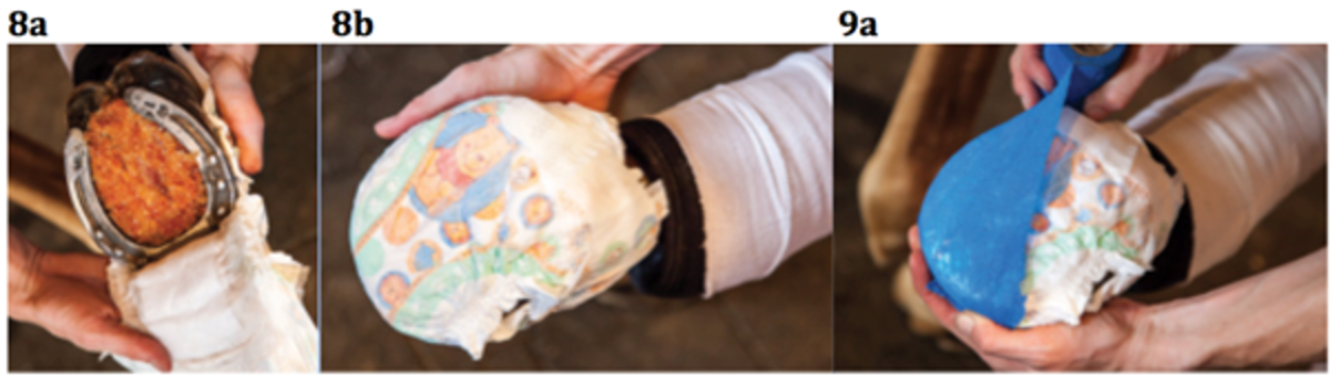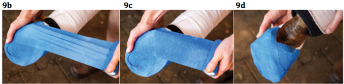 9 A. Beginning at the toe, wrap veterinary wrap around the hoof and toward the bulbs of the heel.