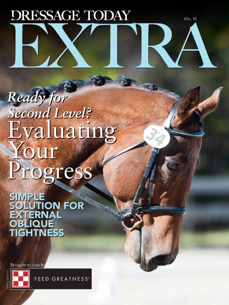 Equestrian biomechanics expert Susanne von Dietze helps a student evaluate her progress before and after their move up to Second Level. Is your horse crooked? We examine a simple solution for external oblique muscle tightness.
