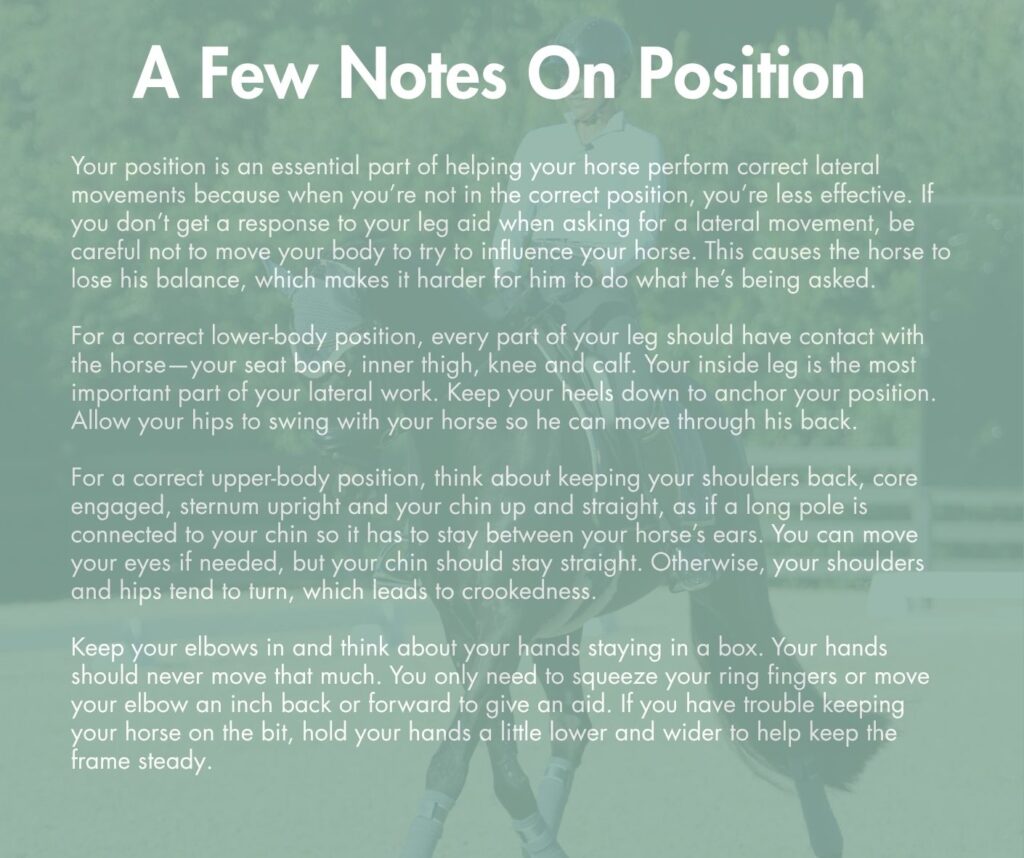 By regularly working on lateral movements, you’ll learn you can access them at any time to influence your horse in the moment—even if it’s simply moving the rib cage slightly or getting the hind leg to cross over an inch.